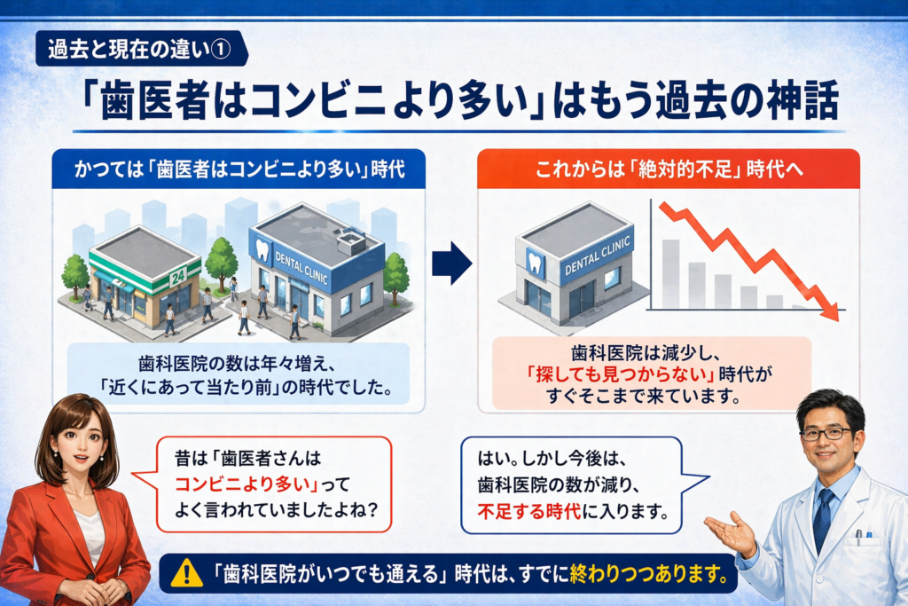 今日は、歯科医師不足の時代、到来!!ということでお話しします。最近まで、コンビニより多い歯科医院と言われていましたが、それも、もう終わりが来ています。これからは歯科医師、歯科医院不足に悩まされる時代になりそうです。